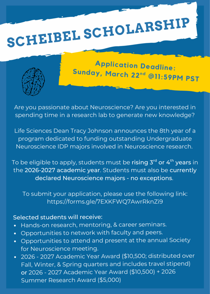 The Scheibel Scholarship funds outstanding students in the Undergraduate Neuroscience IDP (uNSIDP) who are interested in pursuing neuroscience research in their 3rd and 4th years at UCLA. This scholarship helps provide financial support, hands-on research experience, mentoring by faculty, career workshops, and networking opportunities for scholarship recipients.